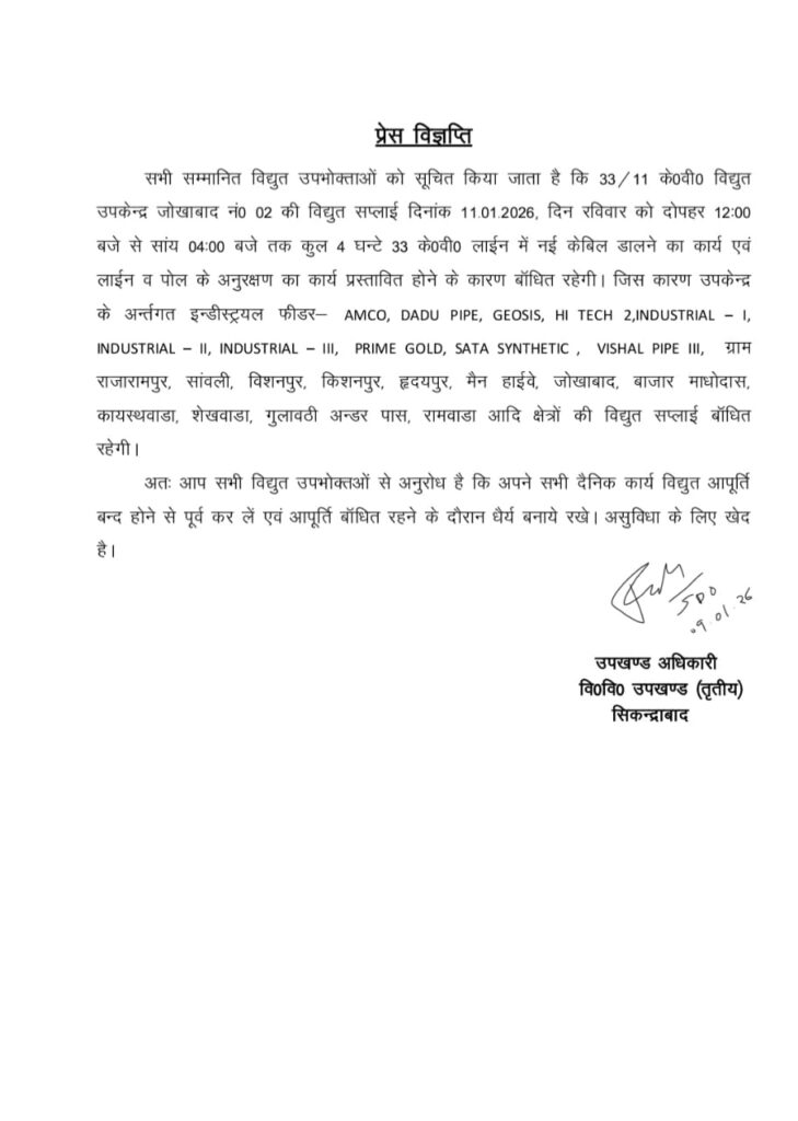 सभी सम्मानित विद्युत उपभोक्ताओं को सूचित किया जाता है कि 33/11 के0वी0 विद्युत उपकेन्द्र जोखाबाद नं0 02 की विद्युत सप्लाई दिनांक 11.01.2026, दिन रविवार को दोपहर 12:00 बजे से सांय 04:00 बजे तक कुल 4 घन्टे 33 के0वी0 लाईन में नई केबिल डालने का कार्य एवं लाईन व पोल के अनुरक्षण का कार्य प्रस्तावित होने के कारण बॉधित रहेगी। जिस कारण उपकेन्द्र के अन्र्तगत इन्डीस्ट्रयल फीडर AMCO, DADU PIPE, GEOSIS, HI TECH 2,INDUSTRIAL – 1, INDUSTRIAL II, INDUSTRIAL III, PRIME GOLD, SATA SYNTHETIC, VISHAL PIPE III, ग्राम राजारामपुर, सांवली, विशनपुर, किशनपुर, हृदयपुर, मैन हाईवे, जोखाबाद, बाजार माधोदास, कायस्थवाडा, शेखवाडा, गुलावठी अन्डर पास, रामवाडा आदि क्षेत्रों की विद्युत सप्लाई बॉधित रहेगी।