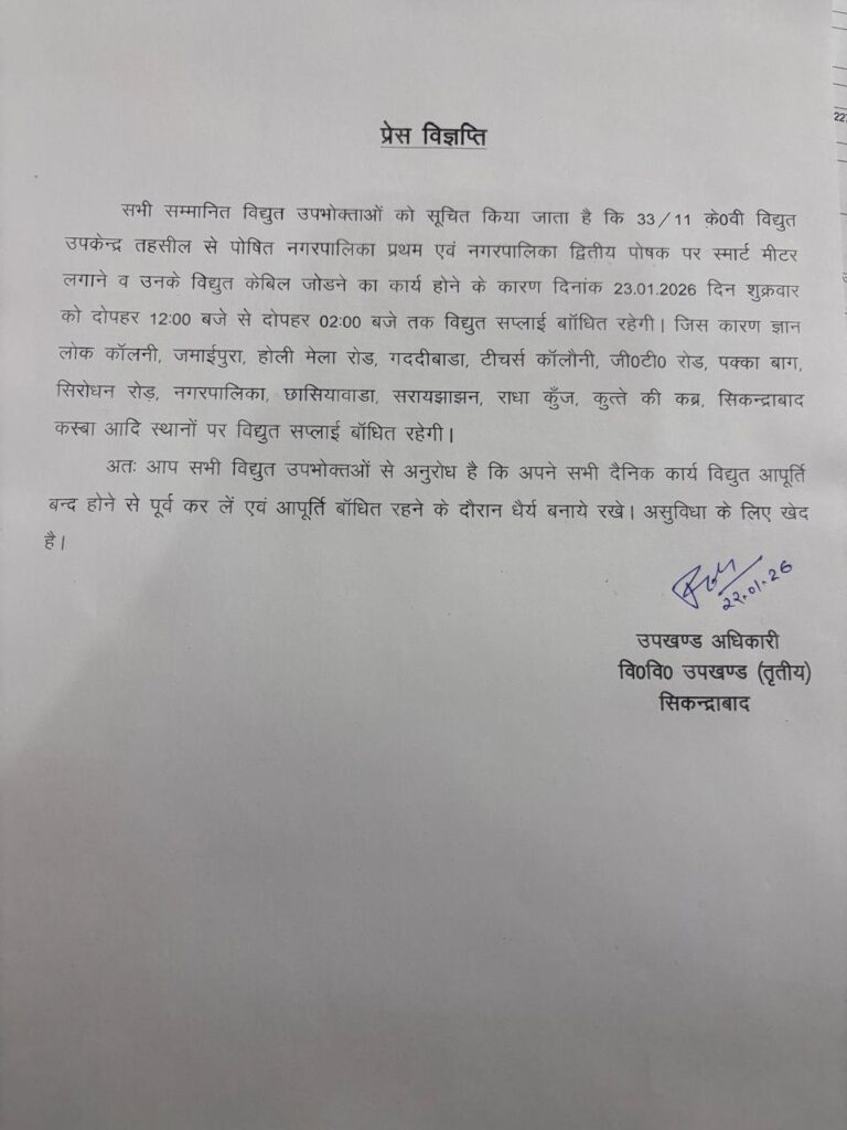 सभी सम्मानित विद्युत उपभोक्ताओं को सूचित किया जाता है कि 33/11 के0वी विद्युत उपकेन्द्र तहसील से पोषित नगरपालिका प्रथम एवं नगरपालिका द्वितीय पोषक पर स्मार्ट मीटर लगाने व उनके विद्युत केबिल जोडने का कार्य होने के कारण दिनांक 23.01.2026 दिन शुक्रवार को दोपहर 12:00 बजे से दोपहर 02:00 बजे तक विद्युत सप्लाई बााँधित रहेगी। जिस कारण ज्ञान लोक कॉलनी, जमाईपुरा, होली मेला रोड, गददीबाडा, टीचर्स कॉलौनी, जी०टी० रोड, पक्का बाग, सिरोधन रोड़, नगरपालिका, छासियावाडा, सरायझाझन, राधा कुँज, कुत्ते की कब्र, सिकन्द्राबाद कस्बा आदि स्थानों पर विद्युत सप्लाई बाँधित रहेगी।