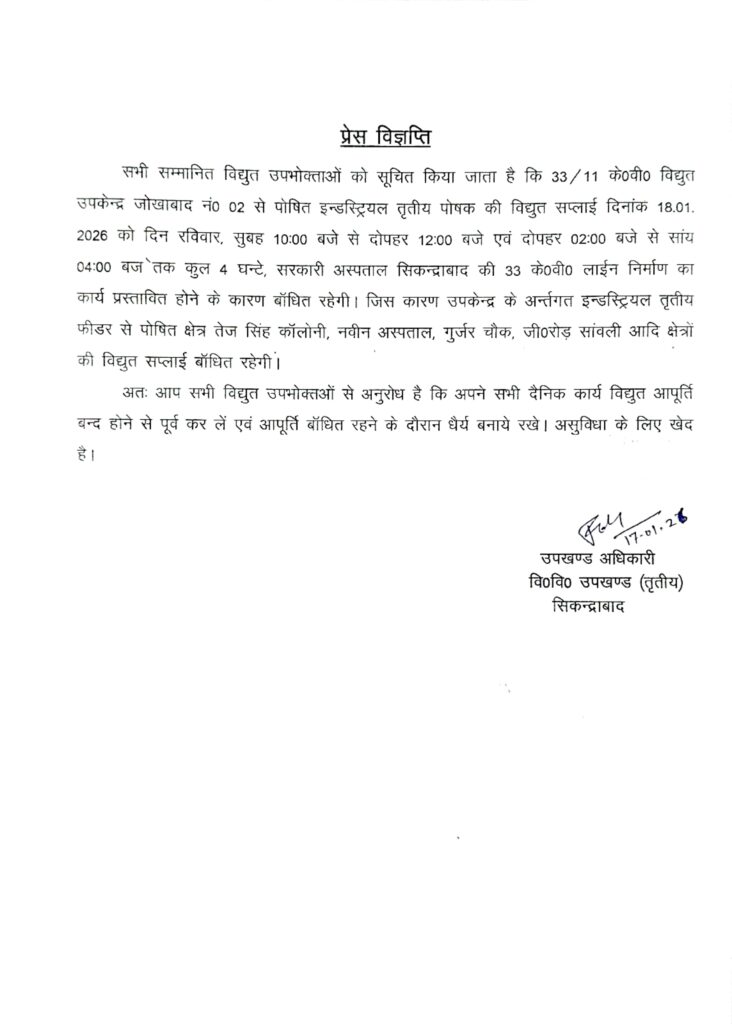 सभी सम्मानित विद्युत उपभोक्ताओं को सूचित किया जाता है कि 33/11 के0वी0 विद्युत उपकेन्द्र जोखाबाद नं0 02 से पोषित इन्डस्ट्रियल तृतीय पोषक की विद्युत सप्लाई दिनांक 18.01. 2026 को दिन रविवार, सुबह 10:00 बजे से दोपहर 12:00 बजे एवं दोपहर 02:00 बजे से सांय 04:00 बज तक कुल 4 घन्टे, सरकारी अस्पताल सिकन्द्राबाद की 33 के०वी० लाईन निर्माण का कार्य प्रस्तावित होने के कारण बाँधित रहेगी। जिस कारण उपकेन्द्र के अन्र्तगत इन्डस्ट्रियल तृतीय फीडर से पोषित क्षेत्र तेज सिंह कॉलोनी, नवीन अस्पताल, गुर्जर चौक, जी०रोड़ सांवली आदि क्षेत्रों की विद्युत सप्लाई बॉधित रहेगी।